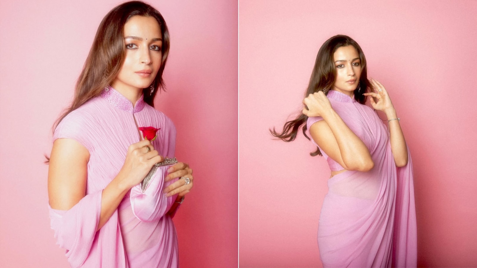 Brides-to-be can take inspiration from Alia Bhatt’s rose-pink chiffon saree look. The standout waterfall-front blouse with high-neck and cap sleeves adds elegance and modern charm, perfectly complementing the saree while creating a graceful silhouette for wedding functions. (Image-instagram/@aliaabhatt)