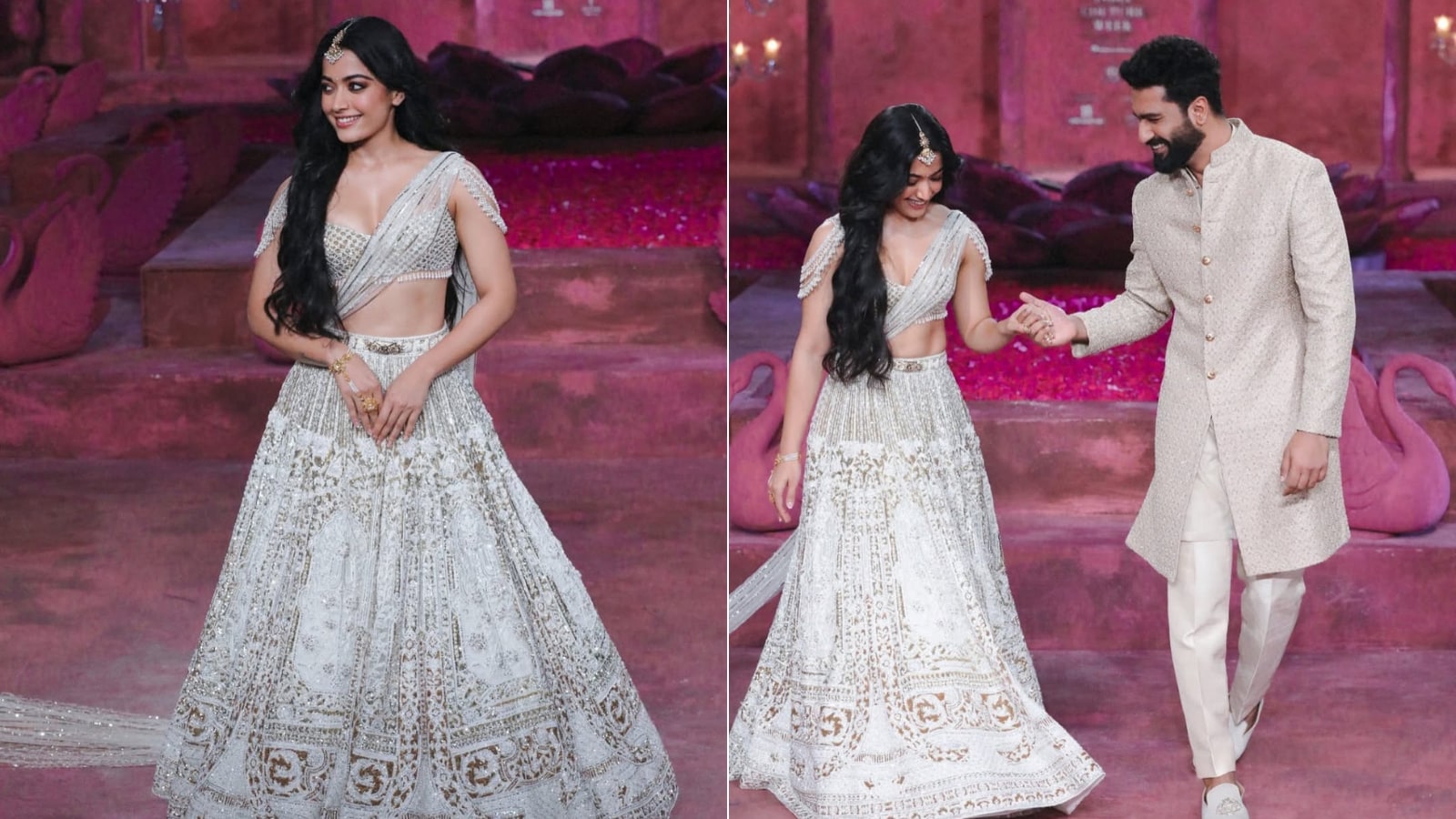 Brides-to-be can try this stunning look inspired by Rashmika Mandanna. Her ivory lehenga adds a glamorous touch with pearls, Swarovski accents, and intricate gold sequins. The cold-shoulder tassel detailing and the elegant trail dupatta elevate the ensemble, making it perfect for standout wedding functions. (Image-instagram/@rashmika_mandanna)