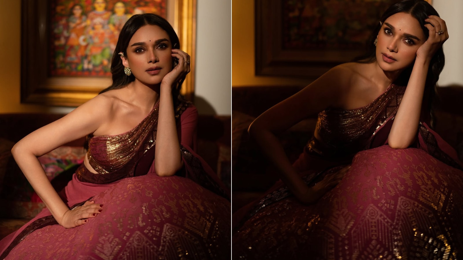 For a modern yet ethereal look, Brides-to-be can draw inspiration from Aditi Rao Hydari. The deep-pink lehenga paired with a one-shoulder, backless blouse featuring gold-pleating detailing exudes regal elegance, offering a perfect balance of sophistication and understated, modern sensuality for wedding functions. (Image-instagram/@aditiraohydari)
