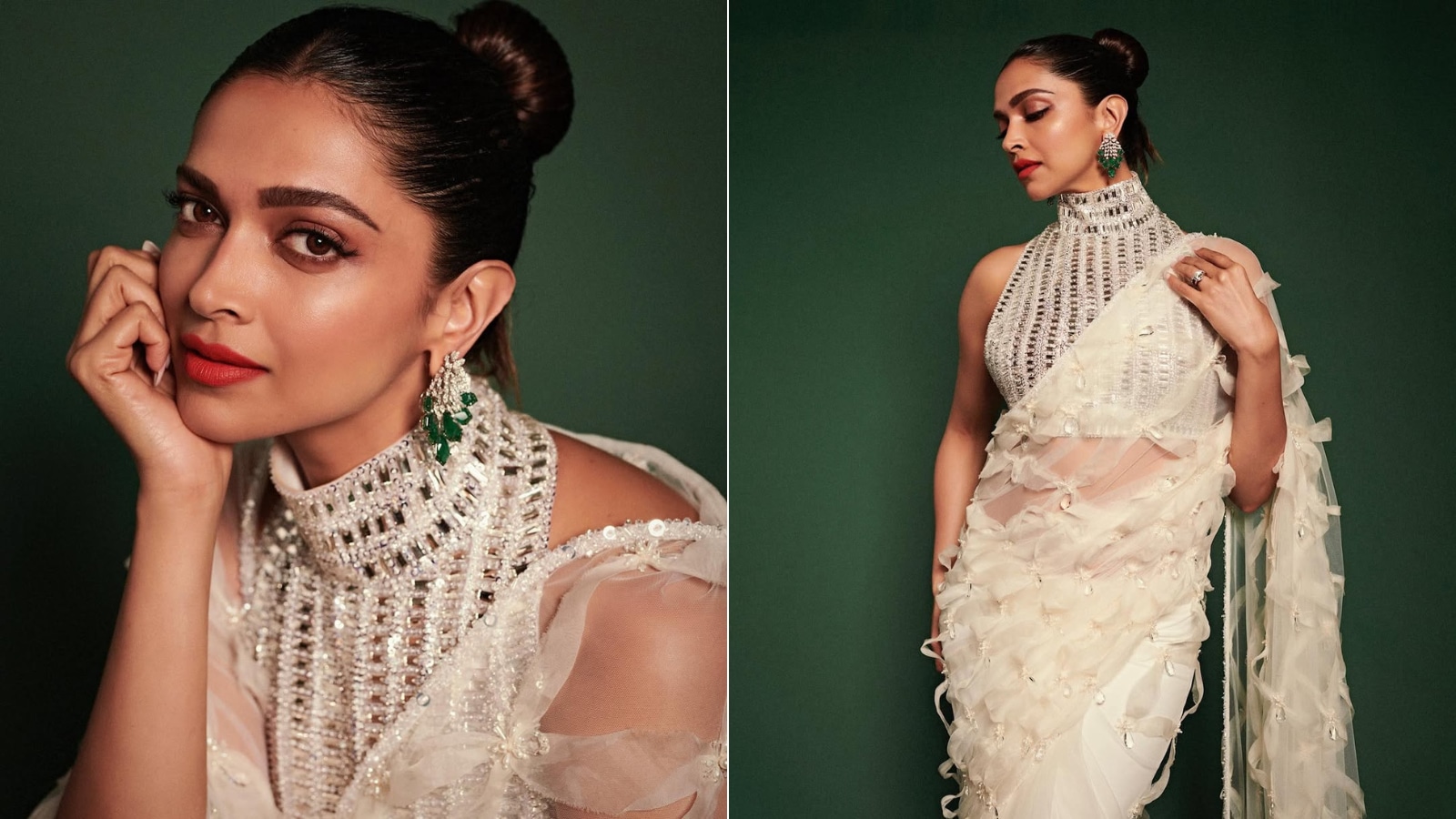 Inspired by trendsetting diva Deepika Padukone, this mirror-work glam blouse with a halter neckline sees a fine thread detailing. This blouse is perfect for mehendi/sangeet or reception function for the brides wanting a sparkling and youthful look. (Image-instagram/@deepikapadukone)