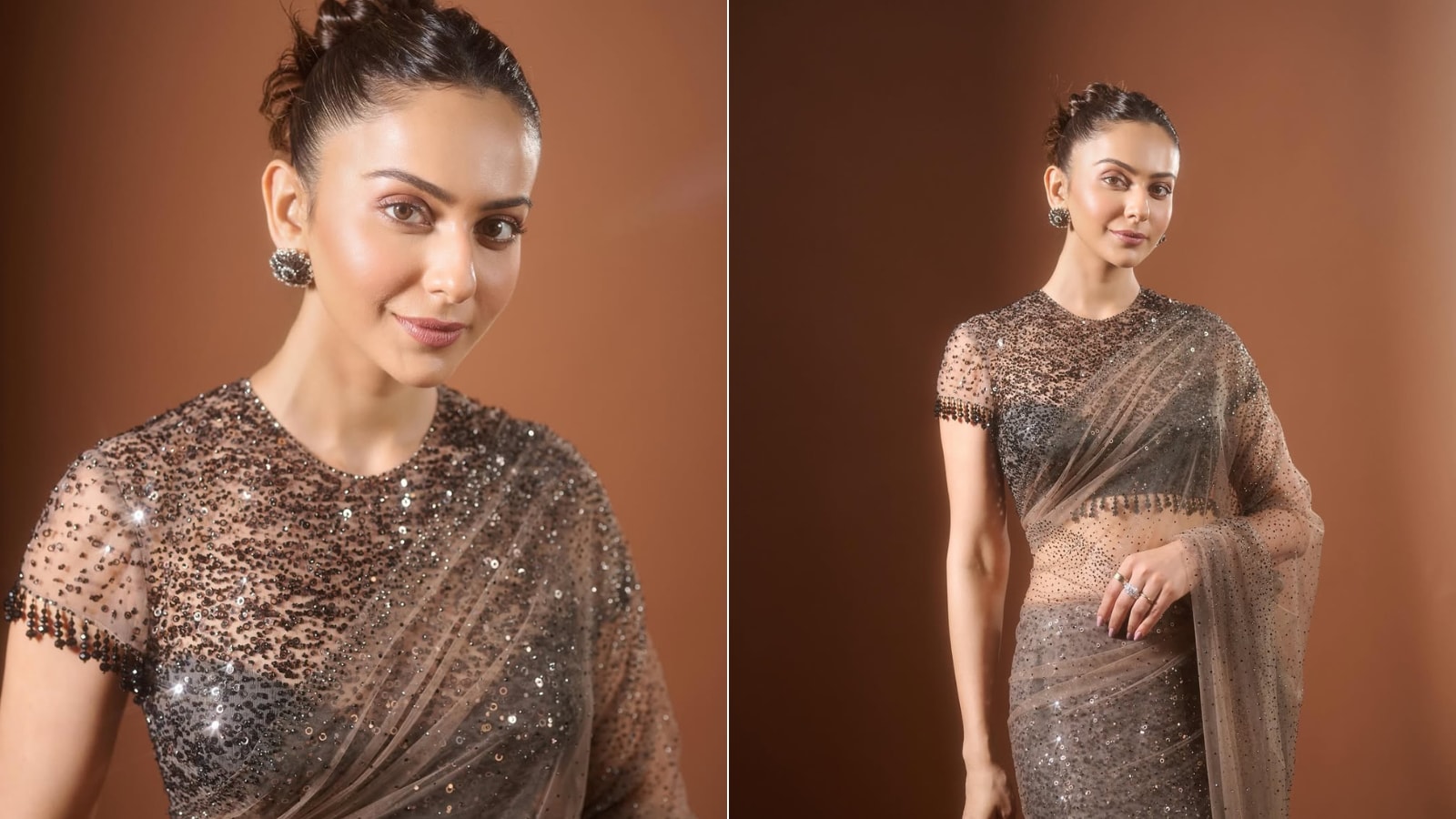 For a redefined cocktail wear, Rakul Preet Singh’s dazzling saree with an intricate blouse detailing is perfect for this wedding season. The border of the blouse and pallu featured droppings, adding a modern finish. The sheer blouse, elevated with shattered sequins, will force you to ditch heavy jewellery. (Image-instagram/@rakulpreetsingh)