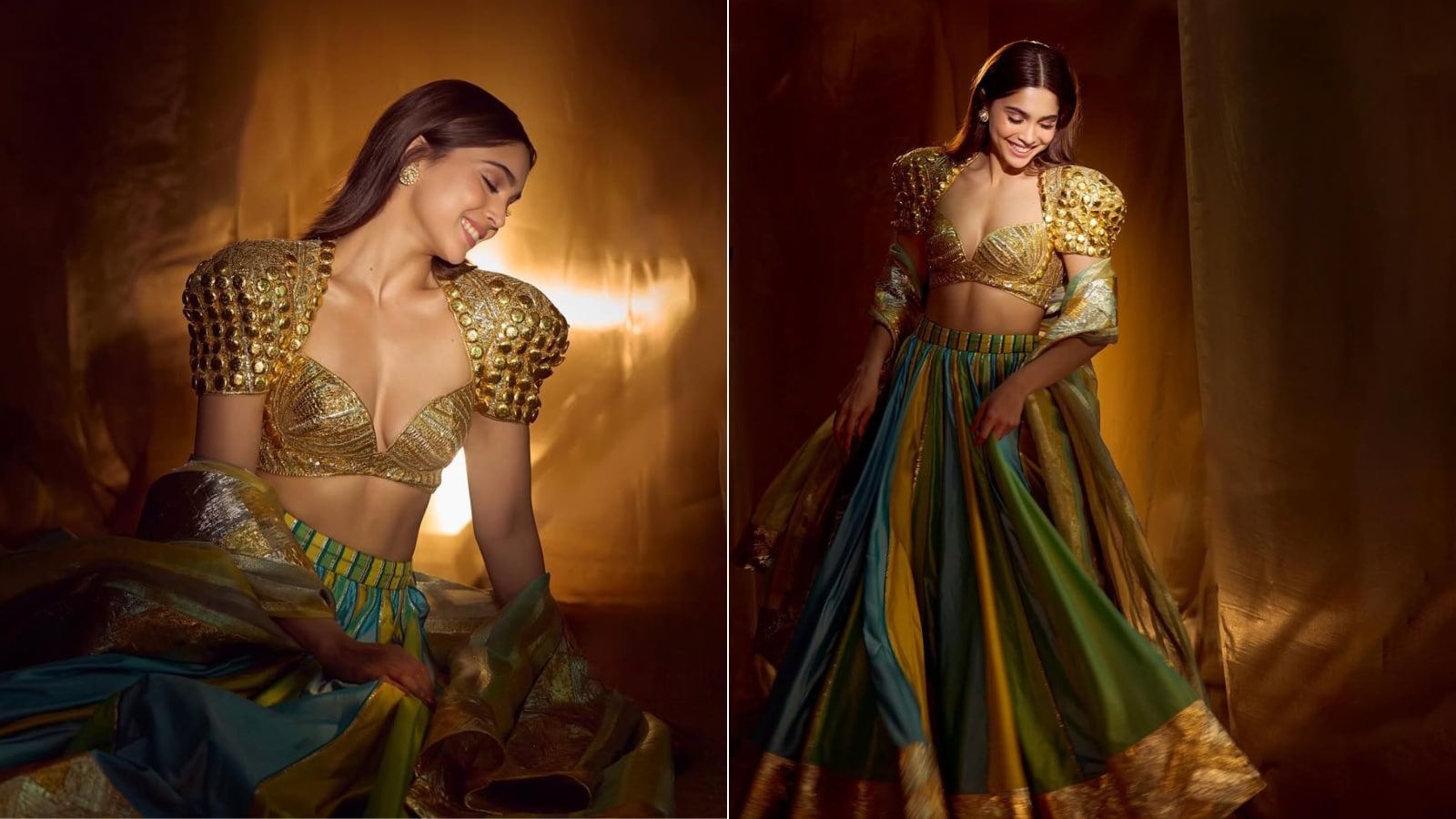 Brides-to-be can draw inspiration from Sharvari Wagh’s lehenga. Her heavily embellished golden blouse with a sweetheart neckline and dramatic balloon sleeves is sure to add a regal appeal. For brides looking for attire that blends tradition with high-fashion drama, this design is perfect for the functions. (Image-instagram/@sharvari)