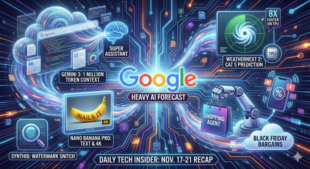 Google cranked its innovation rig to eleven this week, spraying AI upgrades across everything from search queries to storm warnings. Gemini 3 unfurled a million-token context window inside Google Search, Nano Banana Pro finally taught image generators to spell (even at 4K), and SynthID took on the new role of watermark snitch.