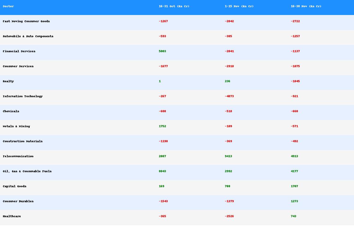 FMCG emerged as the worst hit among consumer-facing segments. FIIs offloaded Rs 2,722 crore worth of FMCG shares in the latter half of November, after selling over Rs 2,040 crore in the first half. Auto stocks also remained under pressure, with Rs 1,257 crore worth of selling in the second half following Rs 385 crore of outflows earlier in the month.