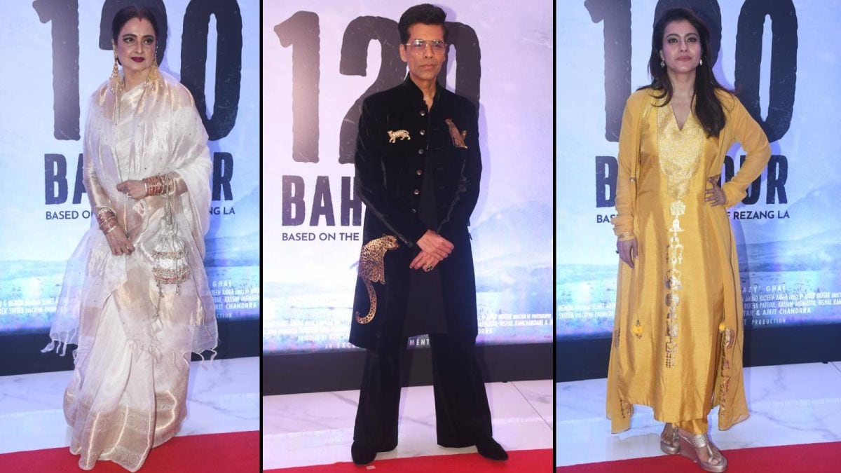 Farhan Akhtar’s 120 Bahadur had a star-studded screening last night in Mumbai. The lead pair of the film, Farhan and Raashii Khanna, looked immaculate in their bandhgala and saree respectively. (Image: Viral Bhayani)